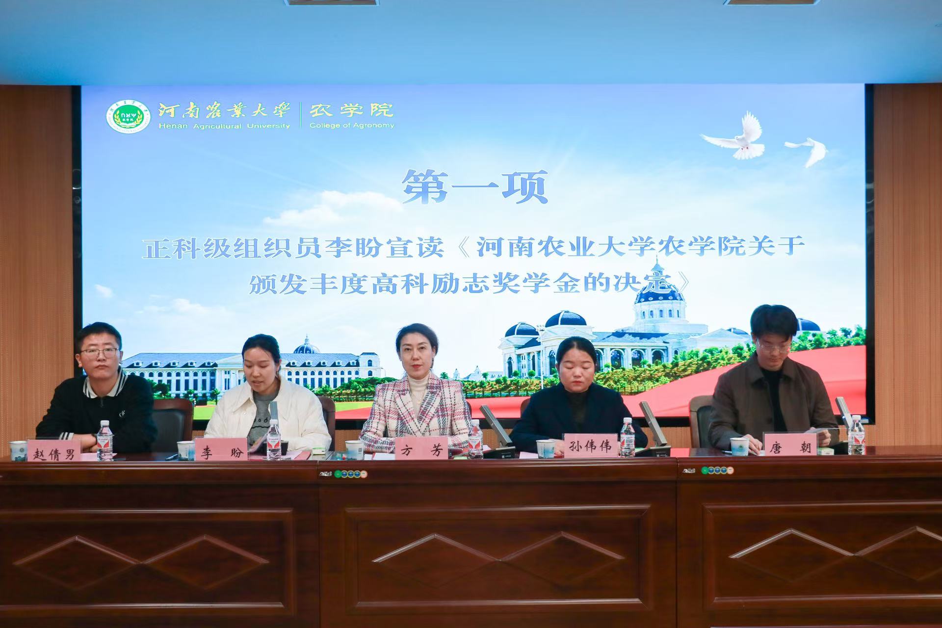 于龙子湖校区第一实验楼南321会议室举行“丰度高科”励志奖学金颁奖仪式。北京丰度高科种业有限公司河南区管理部经理孙伟伟、院党委副书记方芳、团委负责老师、15名获奖学生和学生代表参加仪式,会议由院团委副书记唐朝主持。