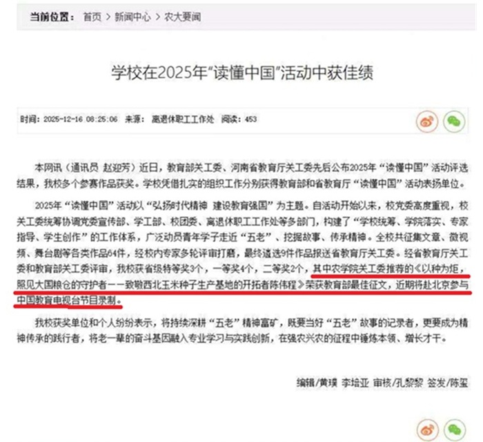 将继续以“读懂中国”等活动为契机,引导学子扎根农业沃土,从农业先辈的奋斗历程中汲取种业振兴、粮食安全的奋进力量,让青春在服务乡村振兴、守护大国粮仓的征程中绽放更耀眼的光芒!